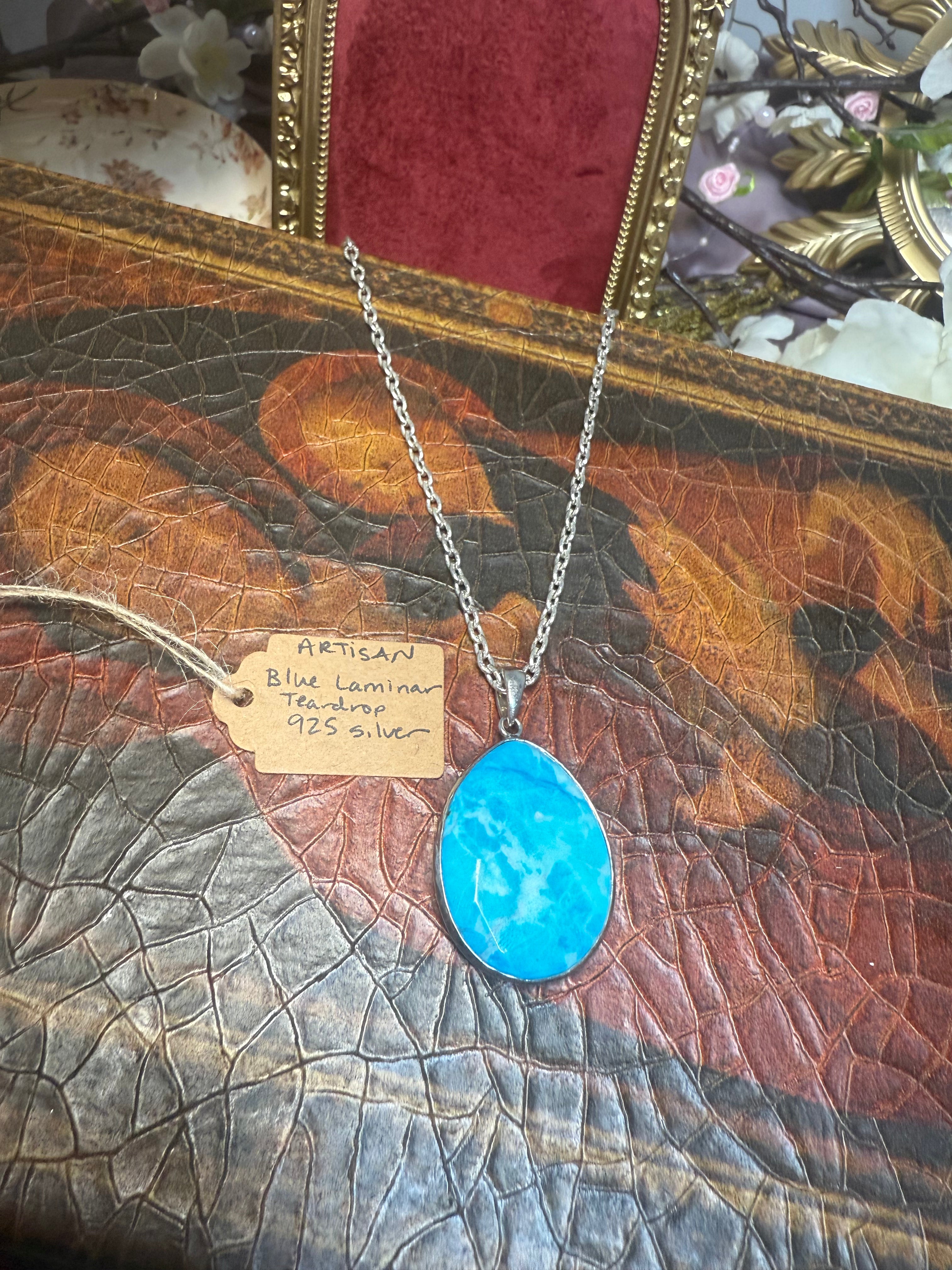 - Larimar-inspired beauty â a blue, oceanic swirl captured in a teardrop pendant that evokes Caribbean skies and sea glass without sacrificing everyday wearability.
