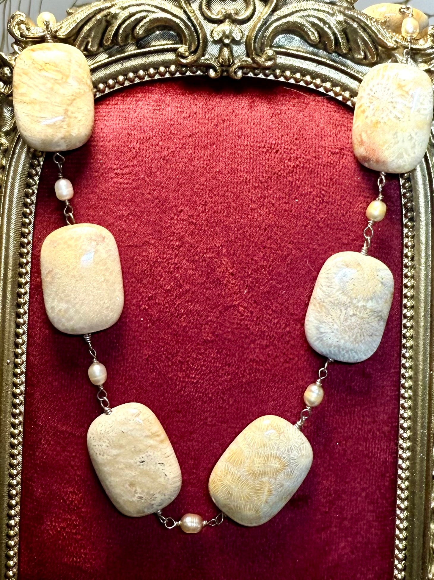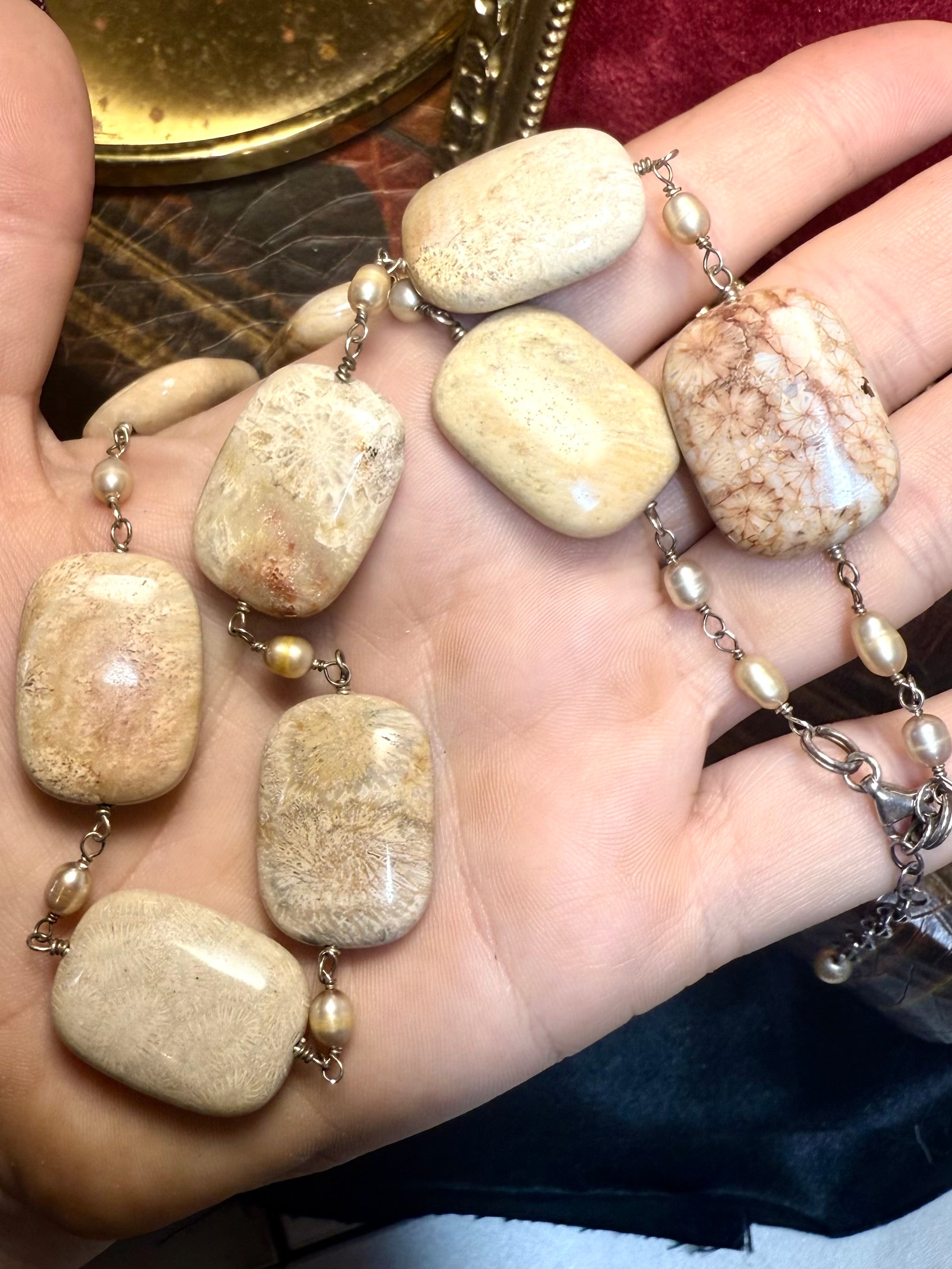 A stunning natural statement necklace featuring large rectangular fossil coral gemstones, each displaying distinct prehistoric flower-like patterns formed over millions of years. These stones are linked with creamy freshwater pearls and hand-wrapped wire detailing, giving the piece an organic, earthy elegance. The palette ranges from soft sand and ivory to warm honey and subtle caramel veining. This necklace has a substantial, luxurious feel while remaining comfortable to wear.