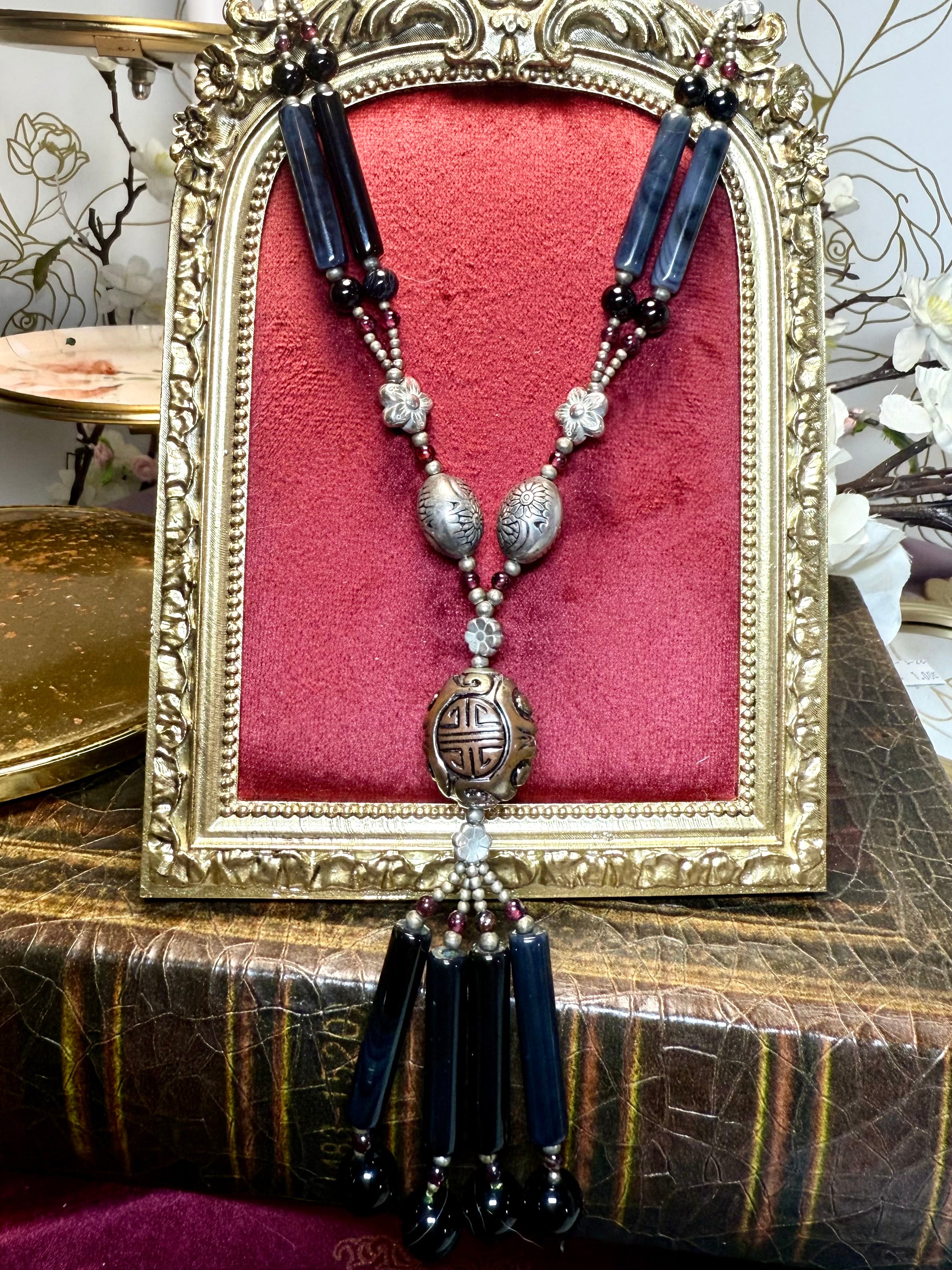 This dramatic, culturally inspired statement necklace blends ornate metalwork with deep navy and black glass elements. The upper portion features elongated blue glass tube beads paired with faceted black beads and tiny burgundy accents, transitioning into two embossed silver-tone oval beads with floral etching. The centerpiece is a beautifully detailed bronze-tone coin-style bead engraved with traditional Asian symbolism. From it, a five-strand fringe drops dramatically, each strand featuring navy glass tubes and glossy black orb finials.