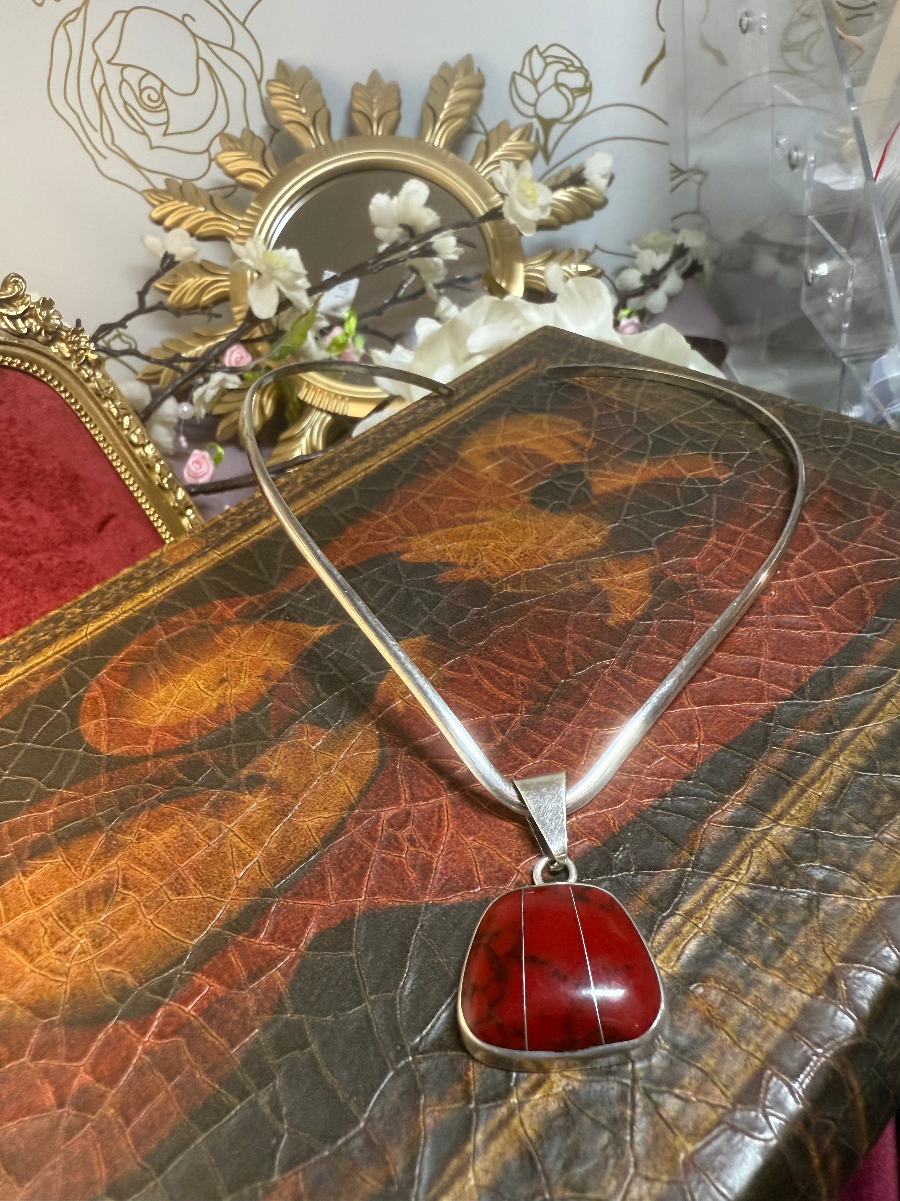 Red Coral Pendant Collar Necklace is a bold, elegant statement piece that blends vibrant color with natural beauty. Handcrafted to celebrate the warmth of red coral, the pendant features a polished gemstone with organic veining, set in a sleek 925 sterling silver bezel. Paired with a modern, sculpted silver collar, this necklace brings a refined, contemporary edge to any outfitâwhether youâre dressing up a simple look or adding personality to a special occasion ensemble.