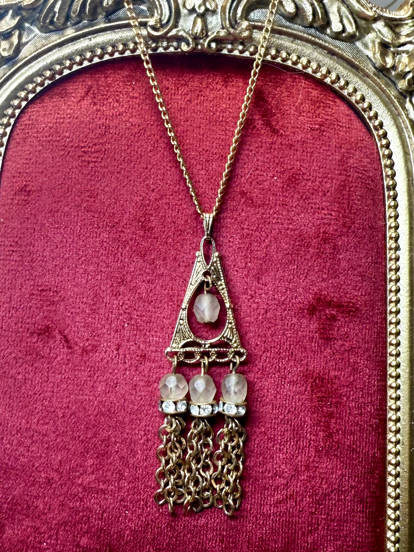 This striking mid-century necklace features a 1960s gold-tone filigree triangle pendant, delicately detailed with etched fan-like lines and openwork shaping. A single frosted glass bead floats at the center, catching soft light. Three matching frosted beads sit below, each topped with a row of sparkling clear rhinestones and finished with cascading gold chain tassels for elegant movement.