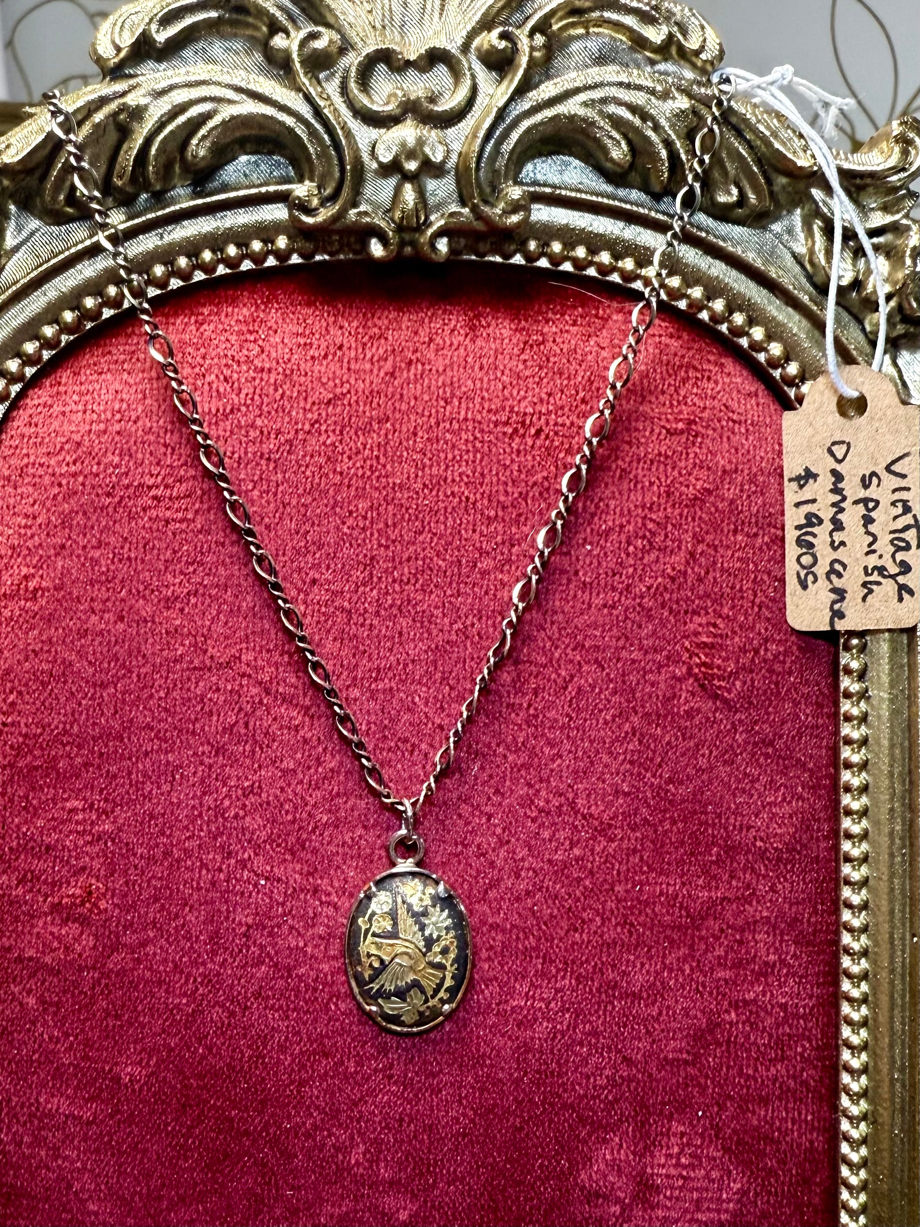 This beautiful vintage necklace features an oval pendant crafted in the classic Spanish Damascene style—a traditional artisan technique known for its intricate inlay-like patterns of gold against a blackened metal background. Bird of paradise etched.