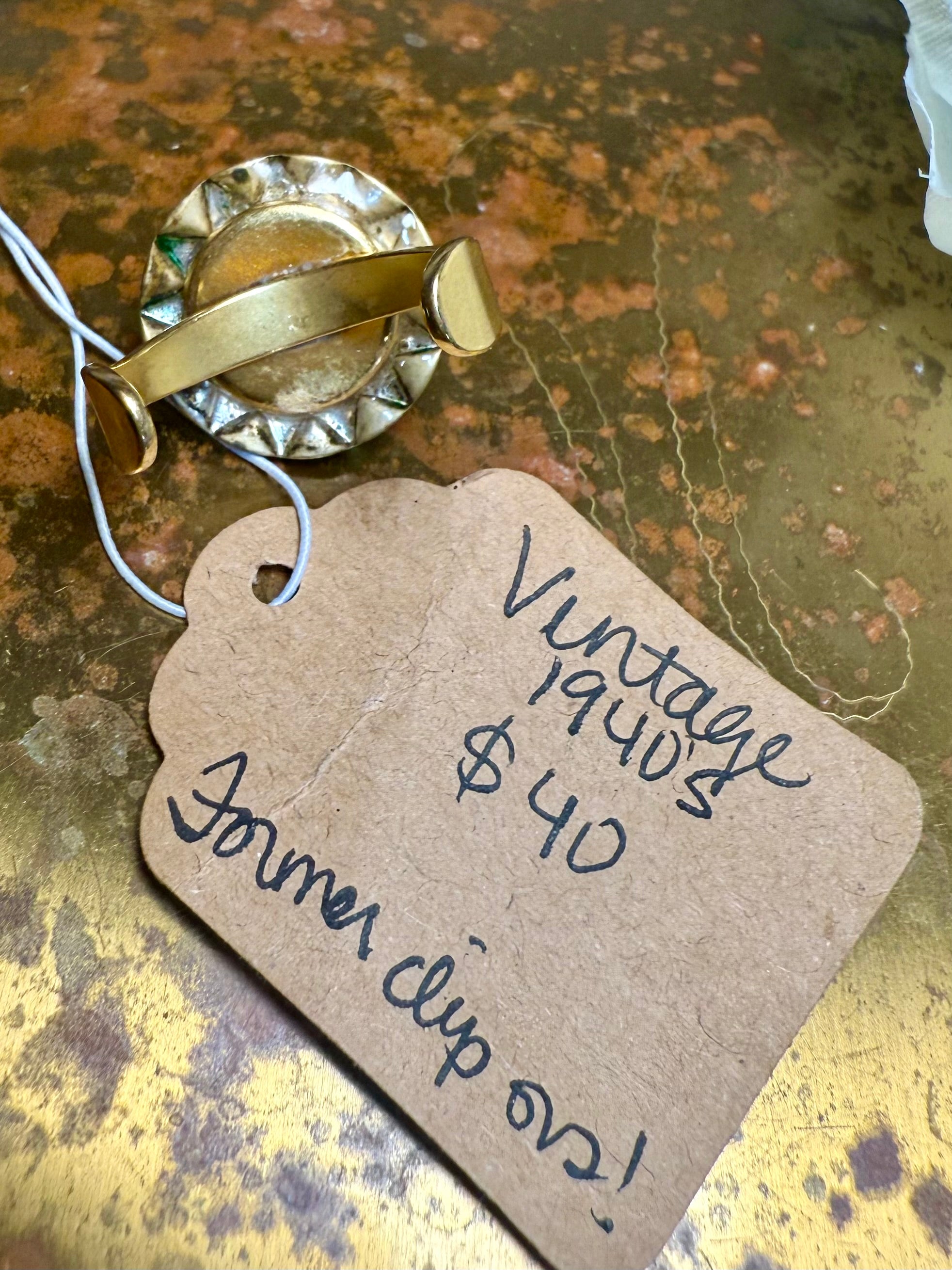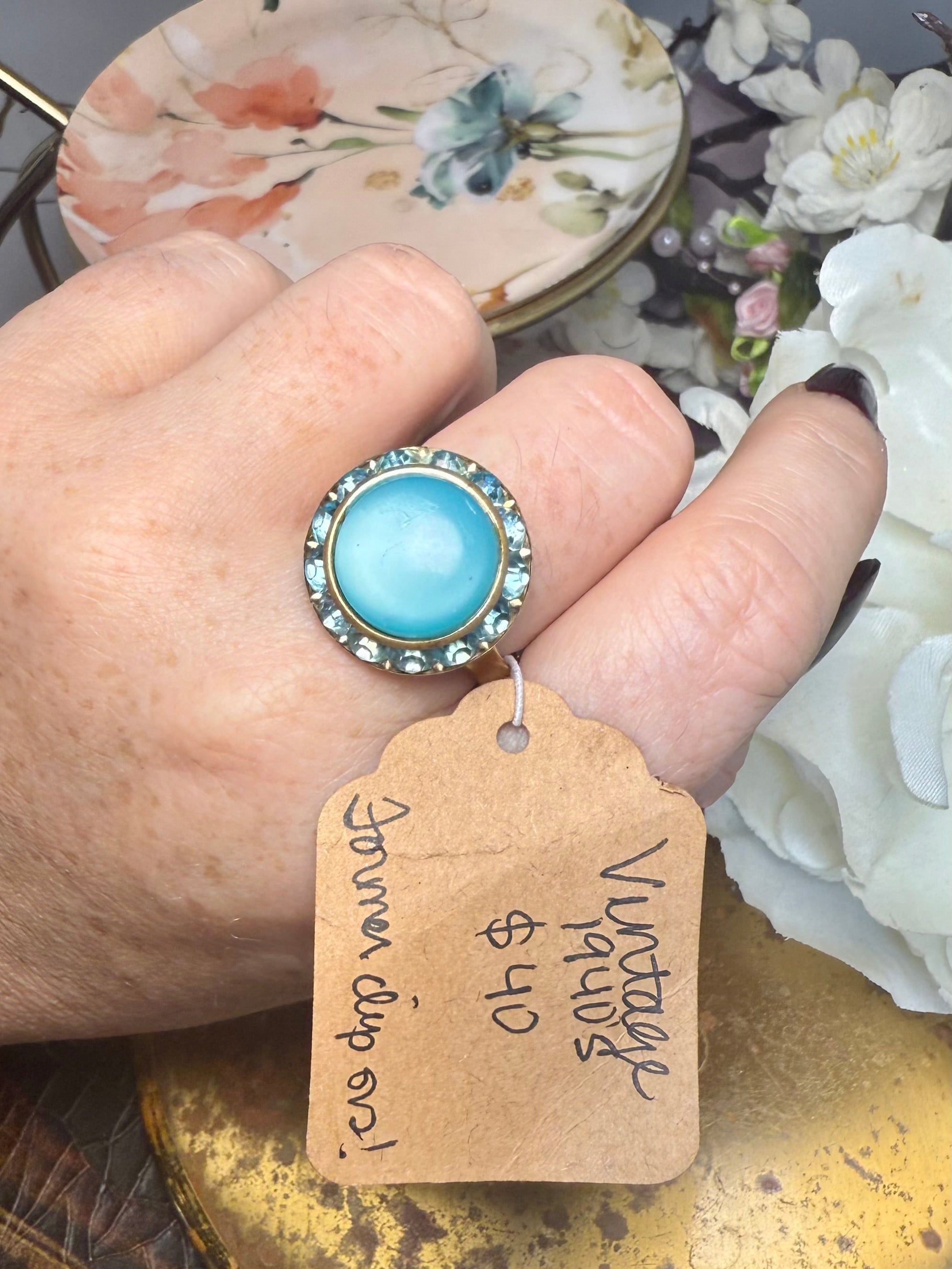 Originally a 1940s statement clip-on earring, this ring showcases a dreamy aqua glass cabochon surrounded by matching rhinestones. Set onto a stainless-steel adjustable band, it combines retro glamour with everyday wearability.