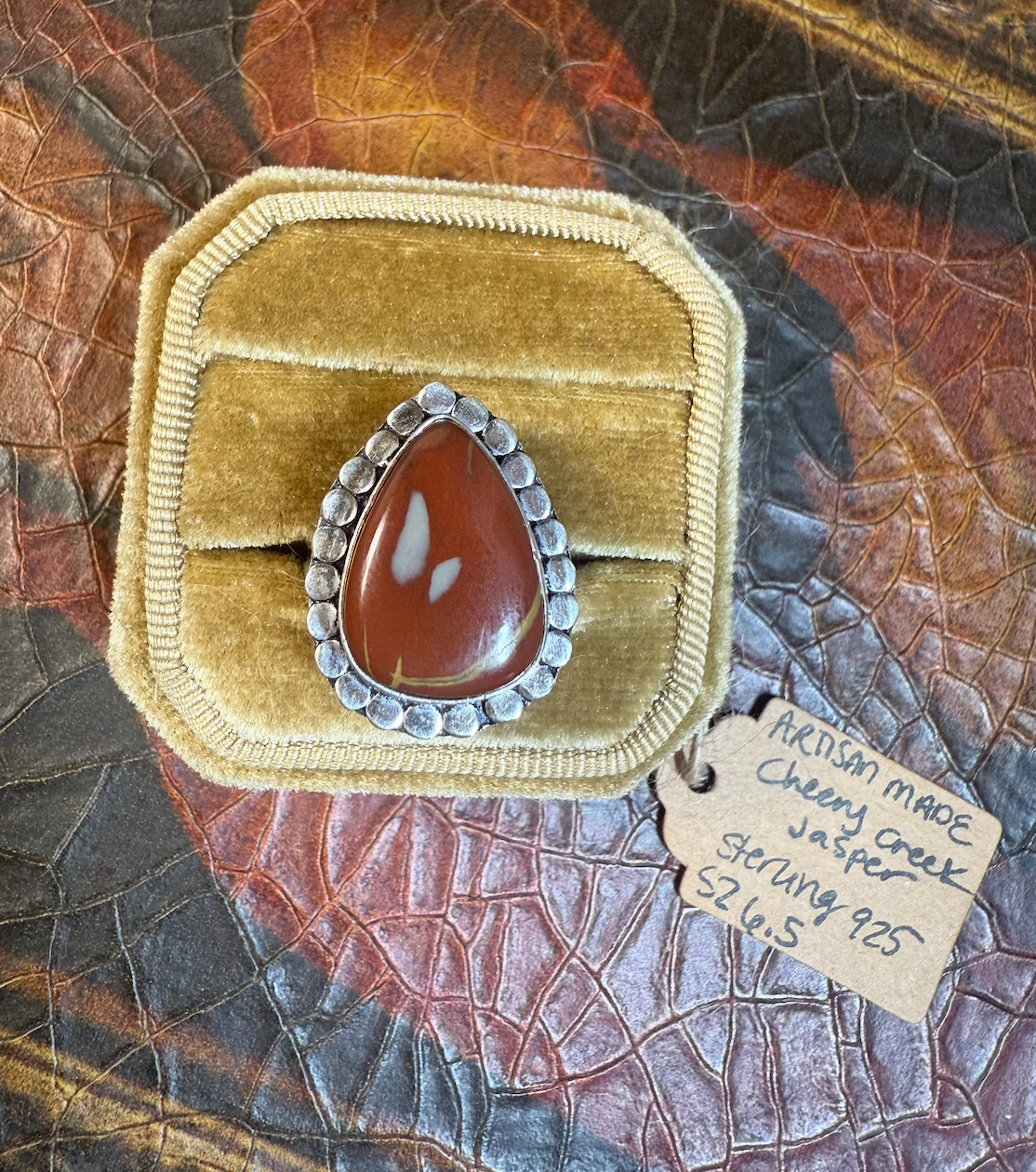 Rich, warm, and beautifully grounded, the Cherry Creek Jasper Artisan Ring in size 6.5 captures the essence of autumn earth and canyon sunsets in a single, wearable work of art. The teardrop gemstone showcases natural swirls of russet red, creamy tan, and golden undertones—so each ring is a unique, one-of-a-kind piece you won’t find in any mass-produced lineup.
