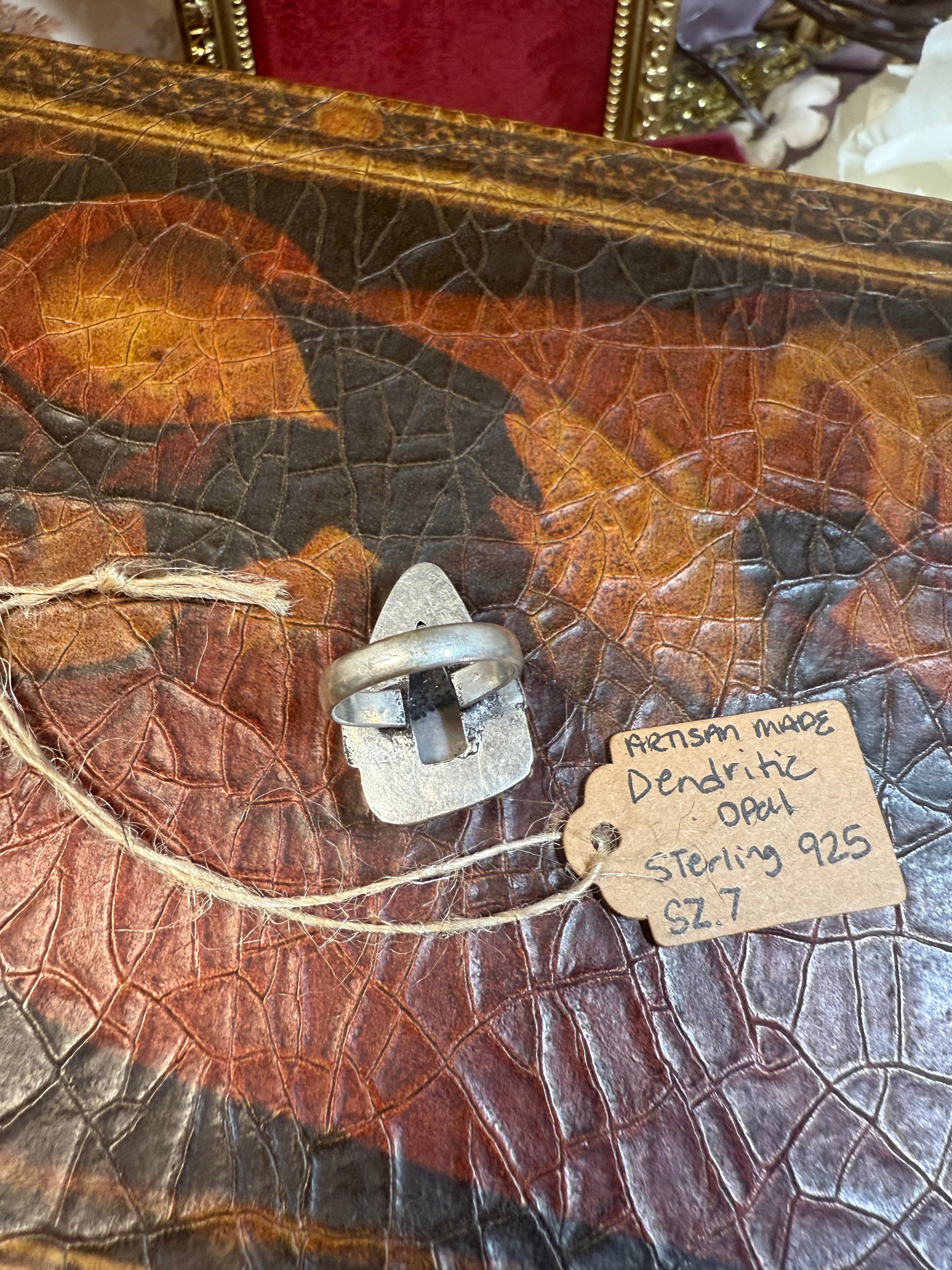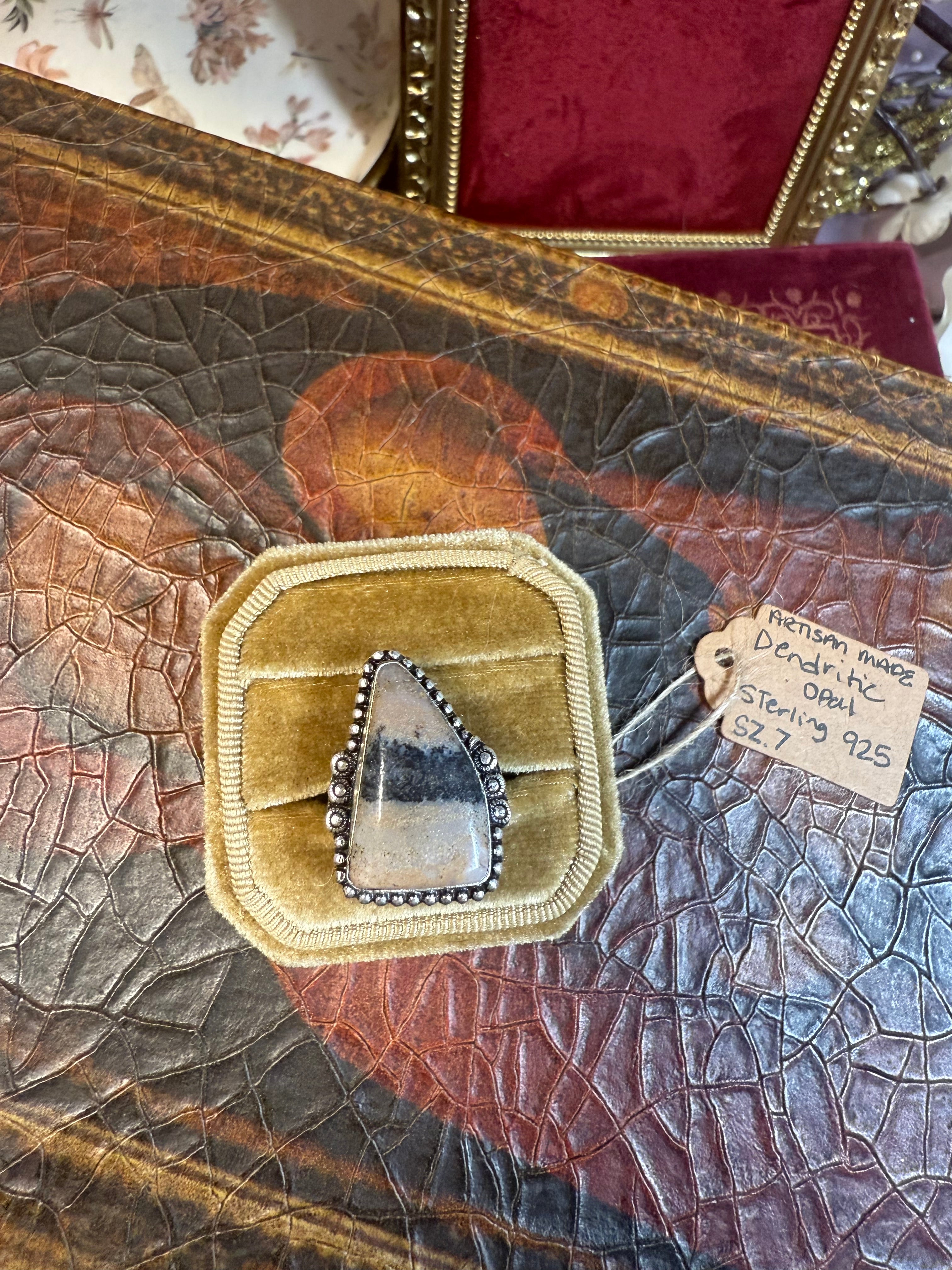 This listing is for a Dendritic Opal Tri-Cut Ring in size 7 — a rare, natural treasure designed to elevate everyday elegance with the quiet, organic beauty of the natural world.